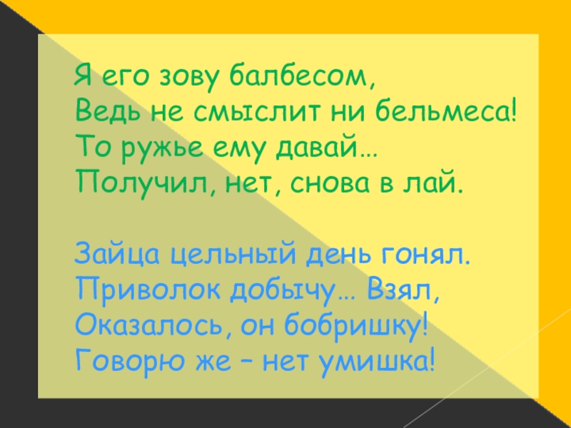 Слайд 15Я его зову балбесом, Ведь не смыслит ни бельмеса! То ружье ему давай… Получил,