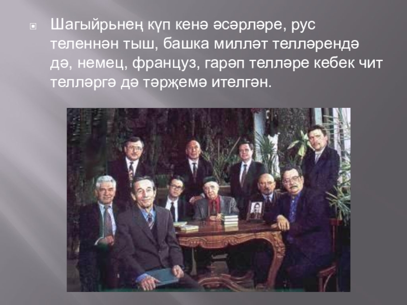 Слайд 6Шагыйрьнең күп кенә әсәрләре, рус теленнән тыш, башка милләт телләрендә дә,