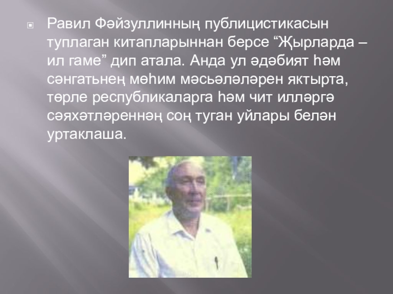 Слайд 7Равил Фәйзуллинның публицистикасын туплаган китапларыннан берсе “Җырларда – ил гаме” дип