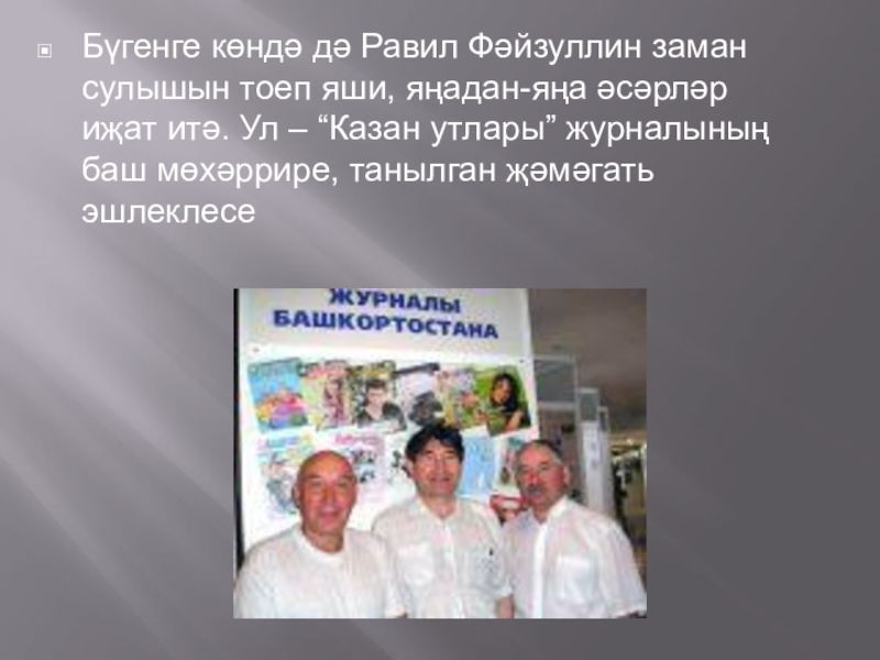 Слайд 8Бүгенге көндә дә Равил Фәйзуллин заман сулышын тоеп яши, яңадан-яңа әсәрләр
