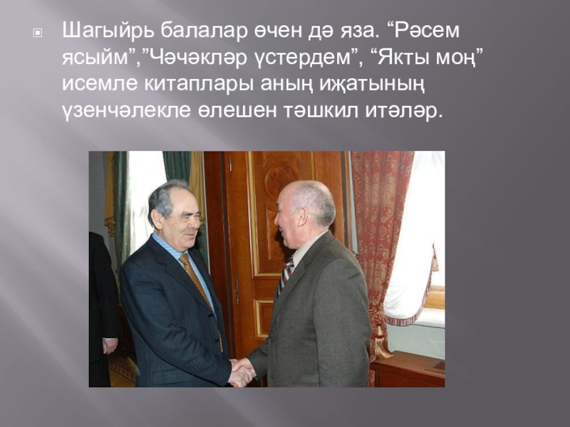 Слайд 4Шагыйрь балалар өчен дә яза. “Рәсем ясыйм”,”Чәчәкләр үстердем”, “Якты моң” исемле