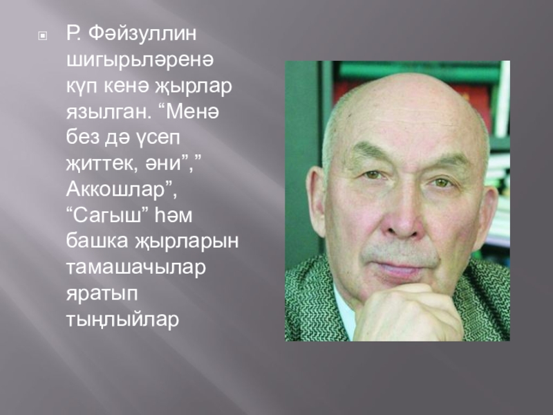 Слайд 5Р. Фәйзуллин шигырьләренә күп кенә җырлар язылган. “Менә без дә үсеп