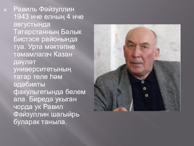 Слайд 2Равиль Фәйзуллин 1943 нче елның 4 нче августында Татарстанның Балык Бистэсе
