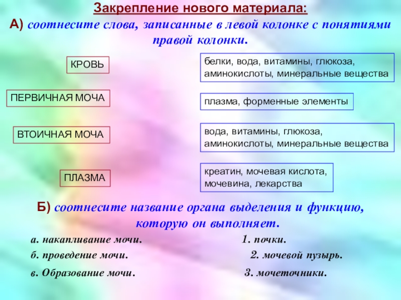 Б) соотнесите название органа выделения и функцию, которую он выполняет.