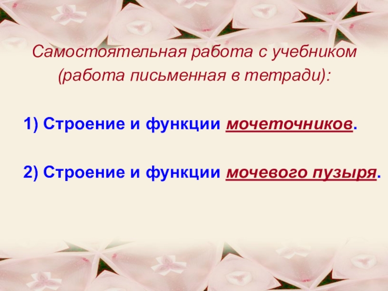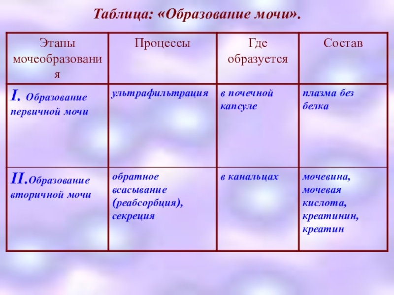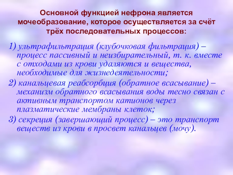 1) ультрафильтрация (клубочковая фильтрация) – процесс пассивный и неизбирательный, т. к. вместе с отходами из крови удаляются и вещества, необходимые для жизнедеятельности;