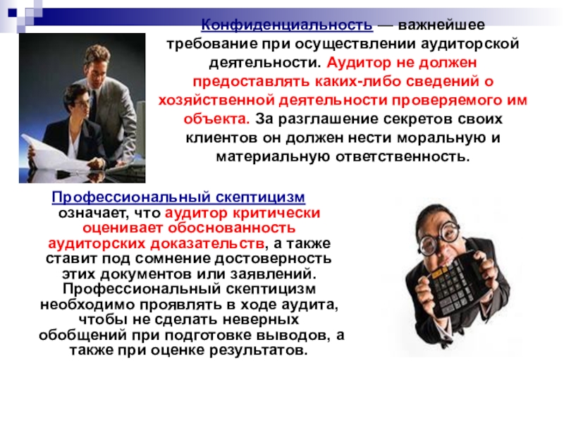 Слайд 7Конфиденциальность — важнейшее требование при осуществлении аудиторской деятельности. Аудитор не должен