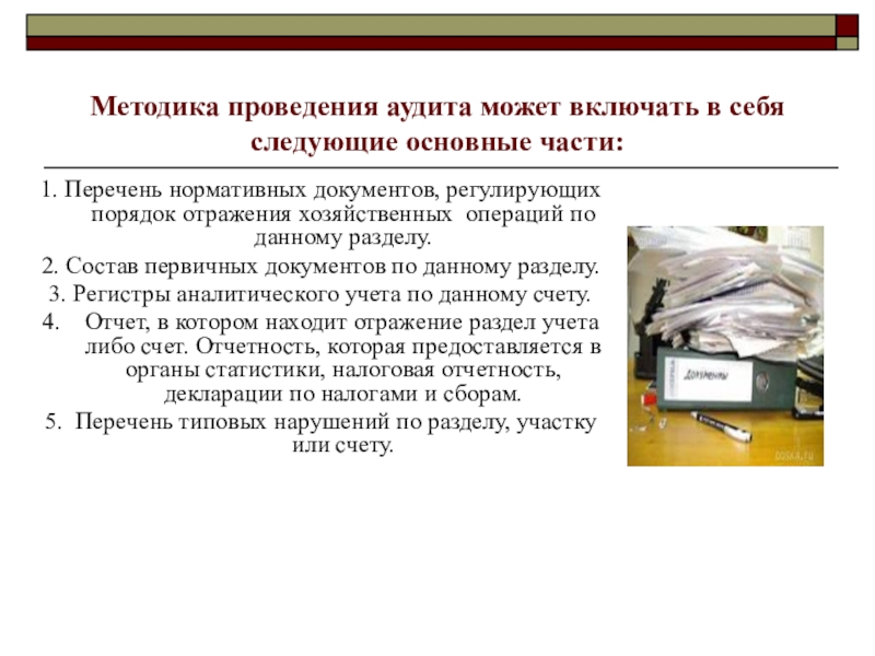 Слайд 48Методика проведения аудита может включать в себя следующие основные части: