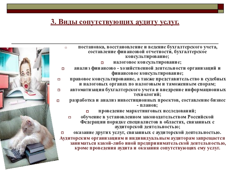Аудиторским организациям и индивидуальным аудиторам запрещается заниматься какой-либо иной предпринимательской деятельностью, кроме проведения аудита и оказания сопутствующих ему услуг.