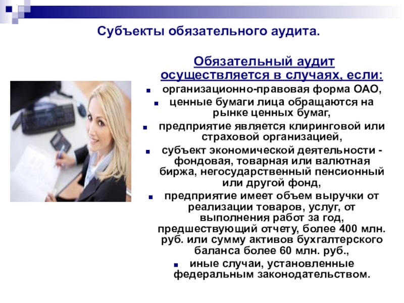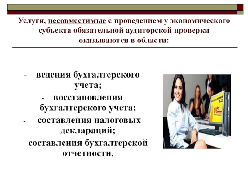Слайд 15Услуги, несовместимые с проведением у экономического субъекта обязательной аудиторской проверки оказываются