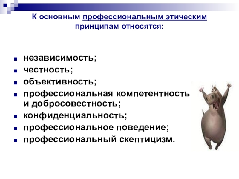 Слайд 4К основным профессиональным этическим принципам относятся: