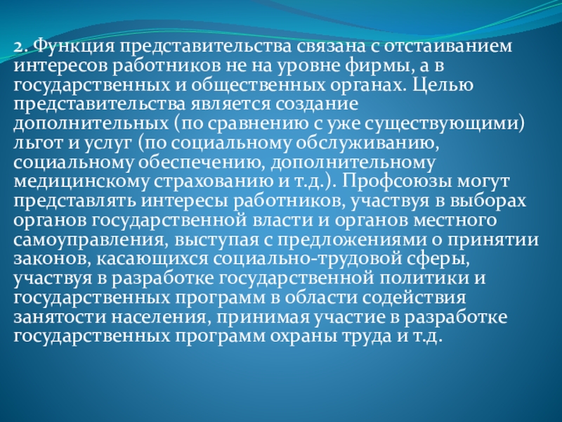 фирмы, а в государственных и общественных органах. Целью представительства является создание дополнительных (по сравнению с уже существующими) льгот и услуг (по социальному обслуживанию, социальному обеспечению, дополнительному медицинскому страхованию и т.д.). Профсоюзы могут представлять интересы работников, участвуя в выборах органов государственной власти и органов местного самоуправления, выступая с предложениями о принятии законов, касающихся социально-трудовой сферы, участвуя в разработке государственной политики и государственных программ в области содействия занятости населения, принимая участие в разработке государственных программ охраны труда и т.д.
