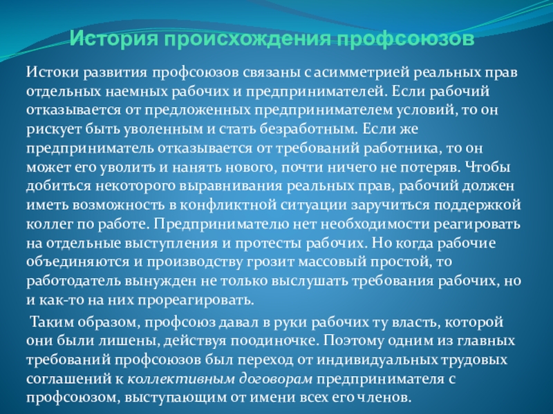 Истоки развития профсоюзов связаны с асимметрией реальных прав отдельных