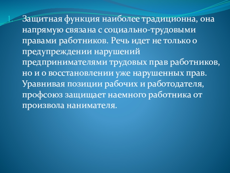 Слайд 13Защитная функция наиболее традиционна, она напрямую связана с социально-трудовыми правами работников.