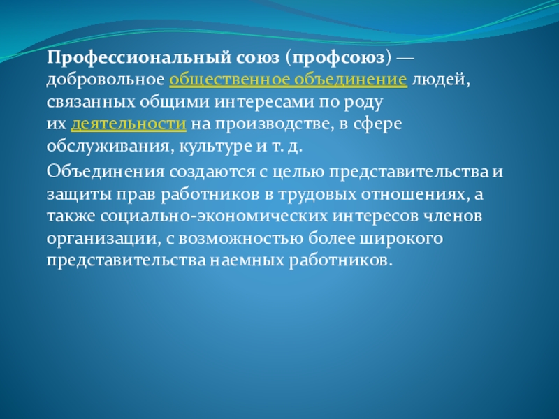 Слайд 10Профессиональный союз (профсоюз) — добровольное общественное объединение людей, связанных общими интересами по роду их деятельности на производстве,