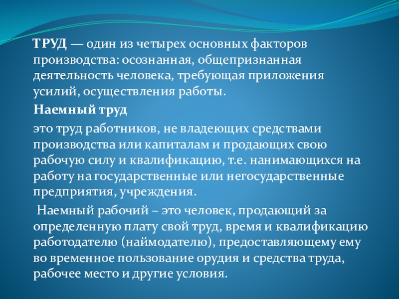 Слайд 3ТРУД — один из четырех основных факторов производства: осознанная, общепризнанная деятельность человека,