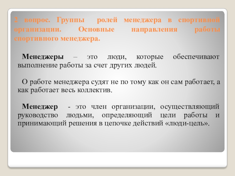 Слайд 152 вопрос. Группы ролей менеджера в спортивной организации. Основные направления работы