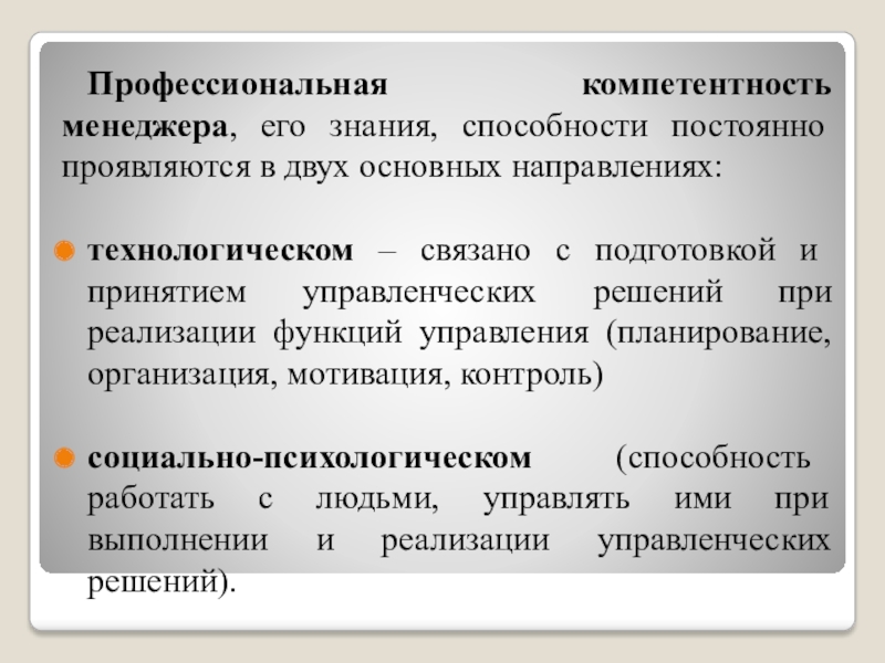 Слайд 17Профессиональная компетентность менеджера, его знания, способности постоянно проявляются в двух основных