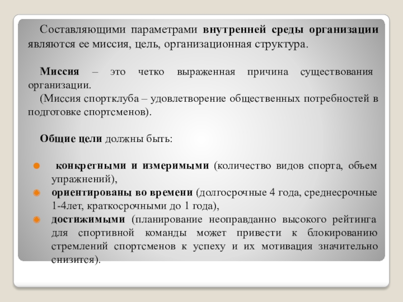 достижимыми (планирование неоправданно высокого рейтинга для спортивной команды может привести к блокированию стремлений спортсменов к успеху и их мотивация значительно снизится).