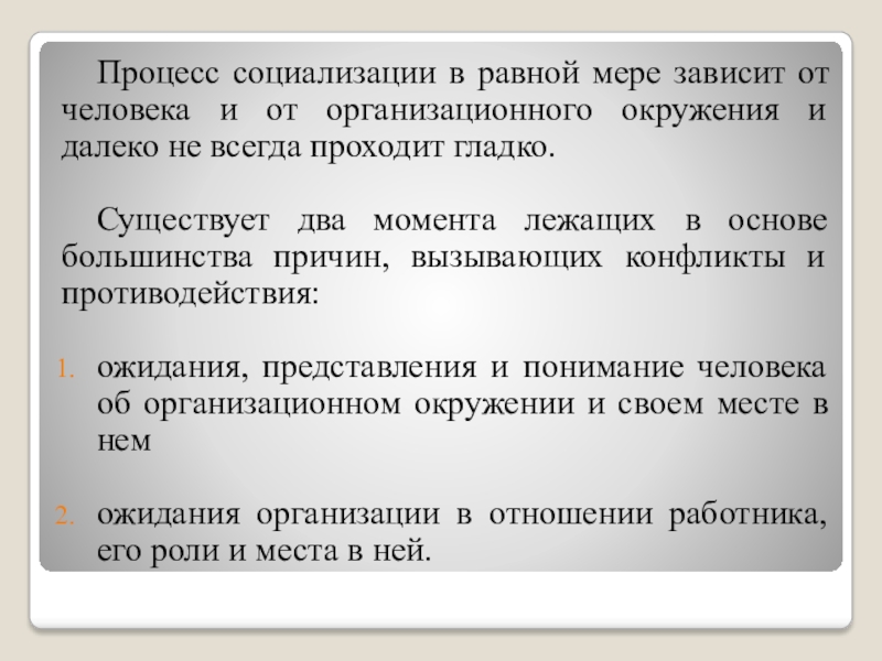 Слайд 19Процесс социализации в равной мере зависит от человека и от организационного