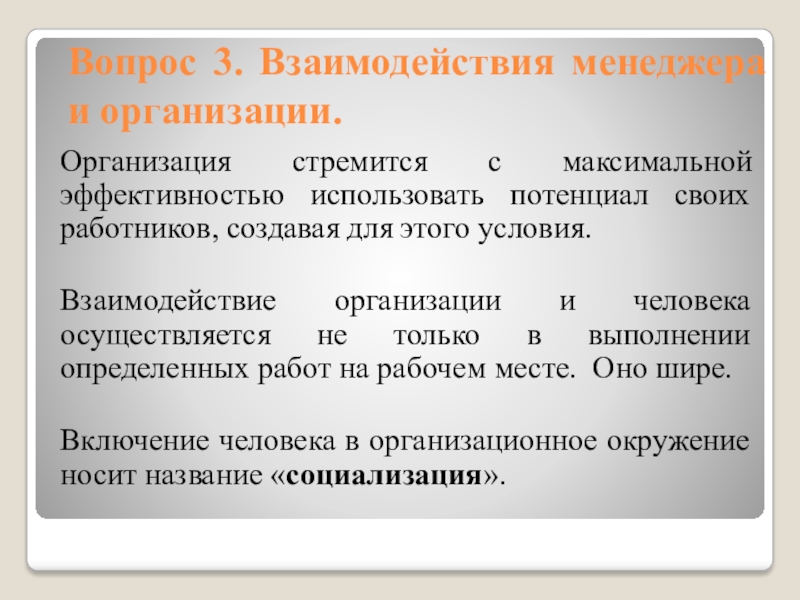 Слайд 18Вопрос 3. Взаимодействия менеджера и организации.