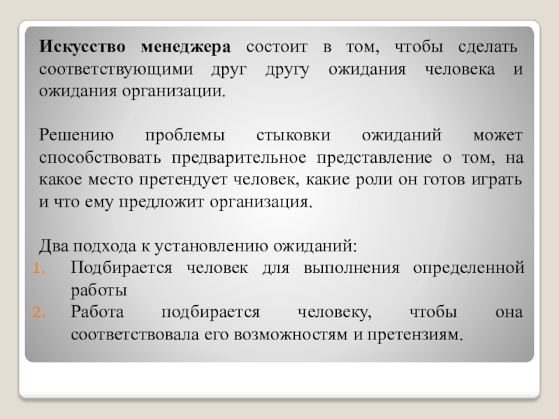 Слайд 20Искусство менеджера состоит в том, чтобы сделать соответствующими друг другу ожидания