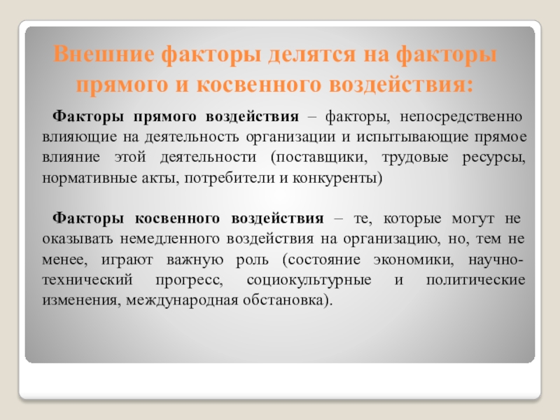 Слайд 7Внешние факторы делятся на факторы прямого и косвенного воздействия: