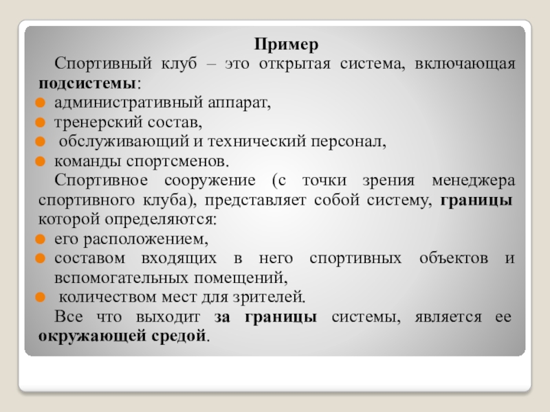 Спортивное сооружение (с точки зрения менеджера спортивного клуба), представляет собой систему, границы которой определяются: