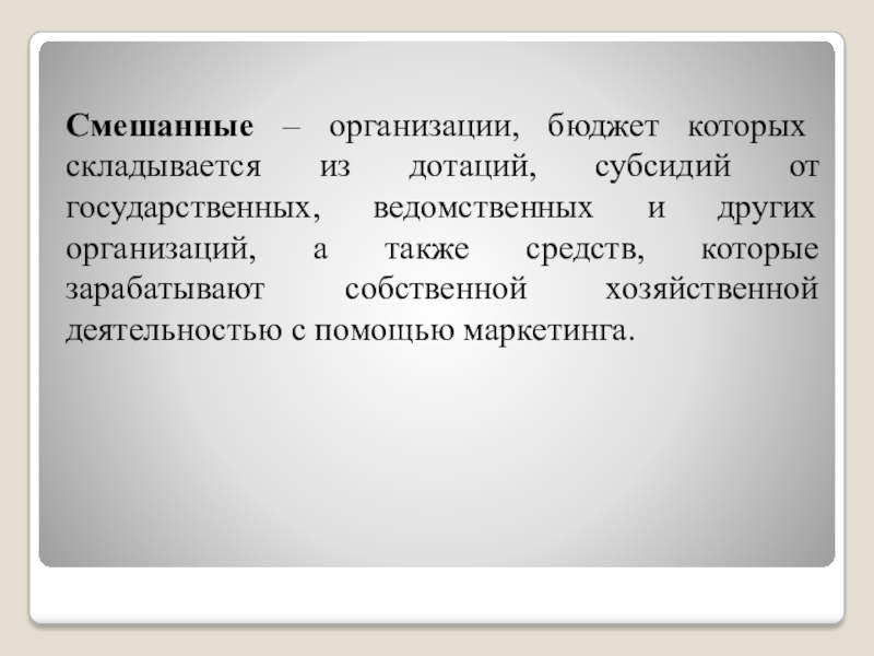 Смешанные – организации, бюджет которых складывается из дотаций, субсидий от государственных,