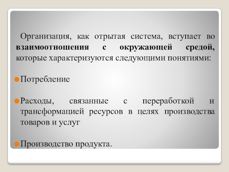 Слайд 11Организация, как отрытая система, вступает во взаимоотношения с окружающей средой, которые