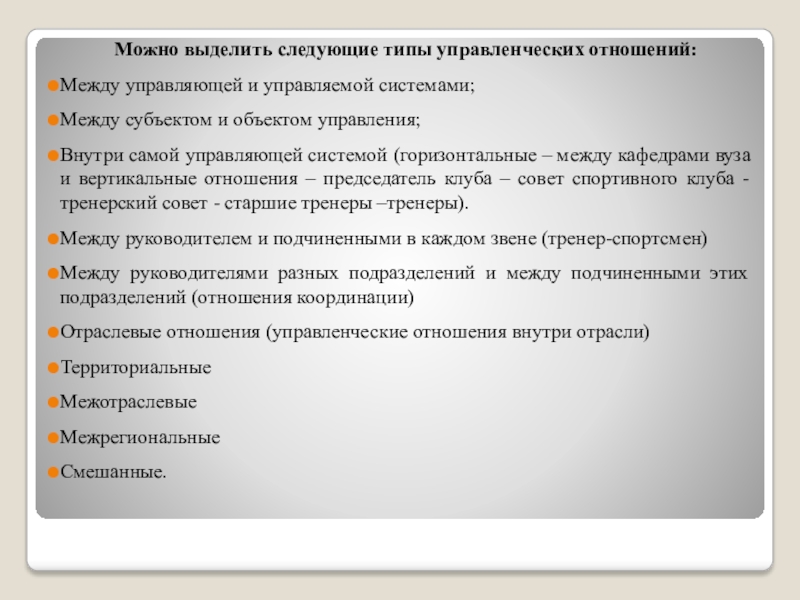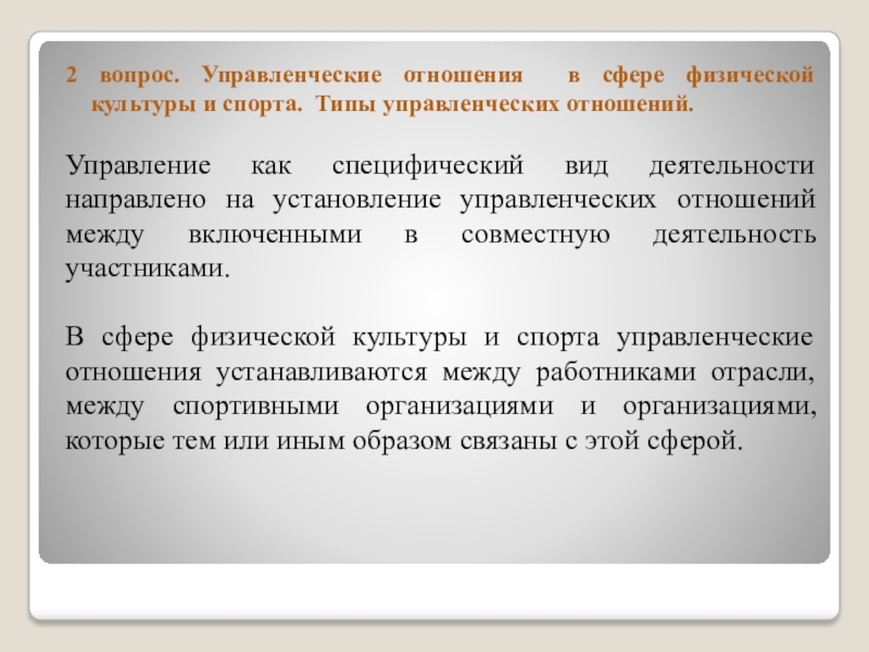 Слайд 262 вопрос. Управленческие отношения в сфере физической культуры и спорта. Типы