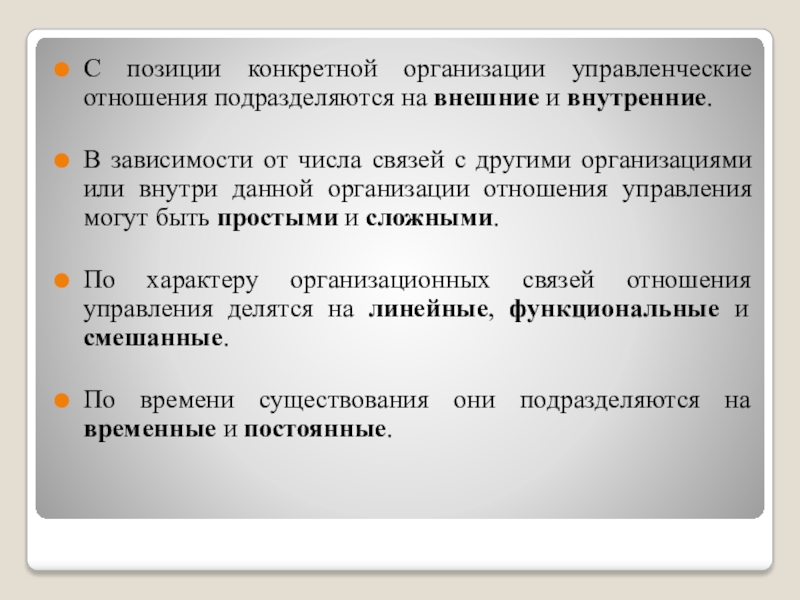 Слайд 28С позиции конкретной организации управленческие отношения подразделяются на внешние и внутренние.