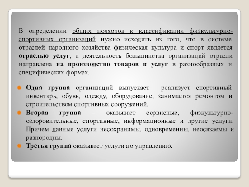 В определении общих подходов к классификации физкультурно-спортивных организаций нужно исходить