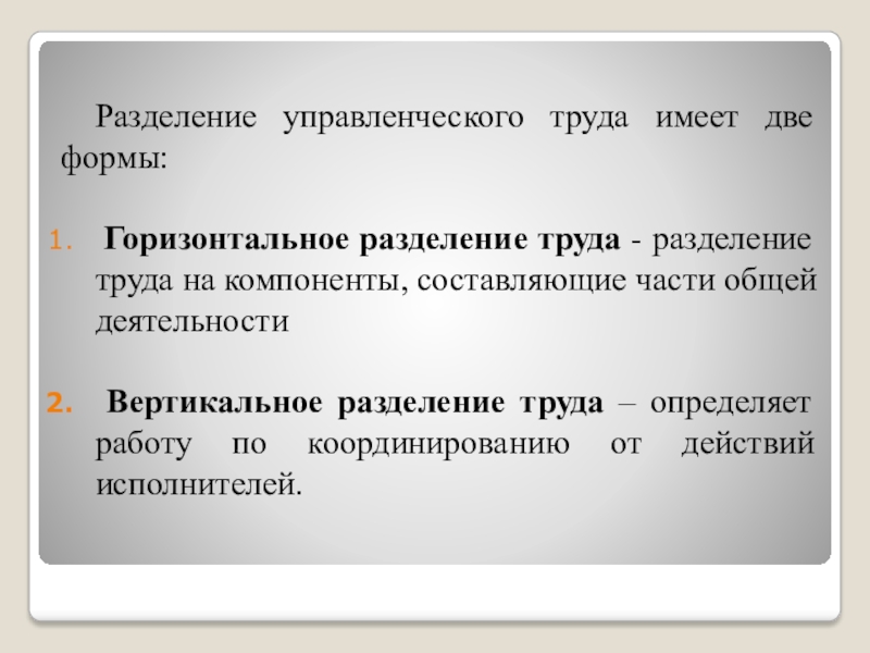 Вертикальное разделение труда – определяет работу по координированию от действий исполнителей.