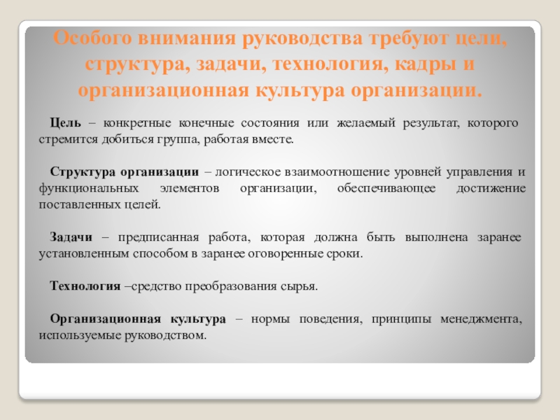 Слайд 12Особого внимания руководства требуют цели, структура, задачи, технология, кадры и организационная