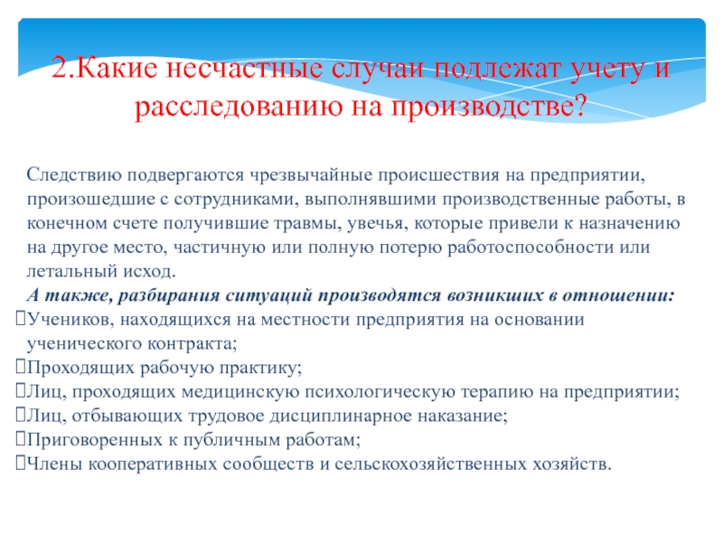 Слайд 52.Какие несчастные случаи подлежат учету и расследованию на производстве?
