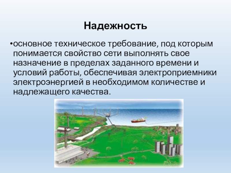 7. Как называется требование, под которым понимается свойство сети выполнять свое назначение в пределах заданного времени и условий работы, обеспечивая электроприемники электроэнергией в необходимом количестве и надлежащего качества?