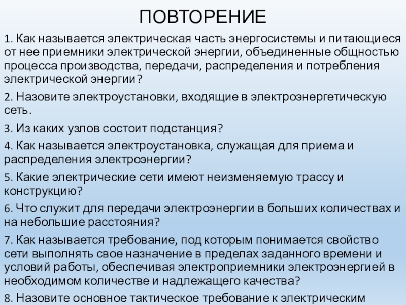 1. Как называется электрическая часть энергосистемы и питающиеся от нее приемники
