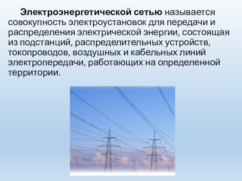 Слайд 3 Электроэнергетической сетью называется совокупность электроустановок для передачи и распределения электрической энергии, состоящая