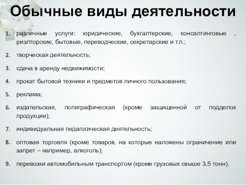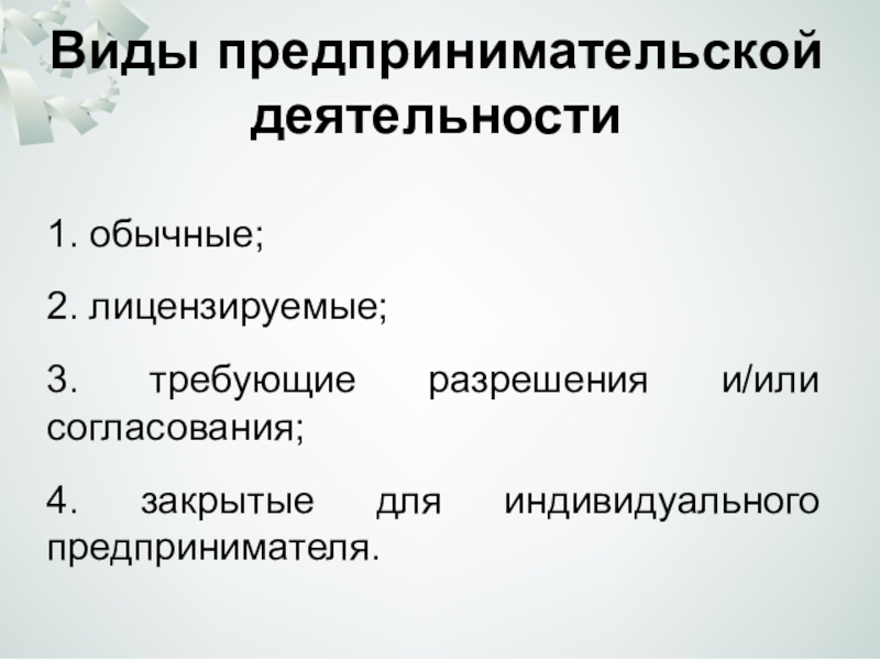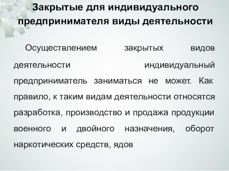 Слайд 41Закрытые для индивидуального предпринимателя виды деятельности
