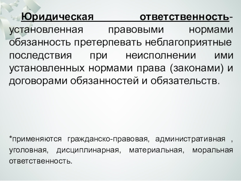Слайд 45 Юридическая ответственность-установленная правовыми нормами обязанность претерпевать неблагоприятные последствия при неисполнении ими