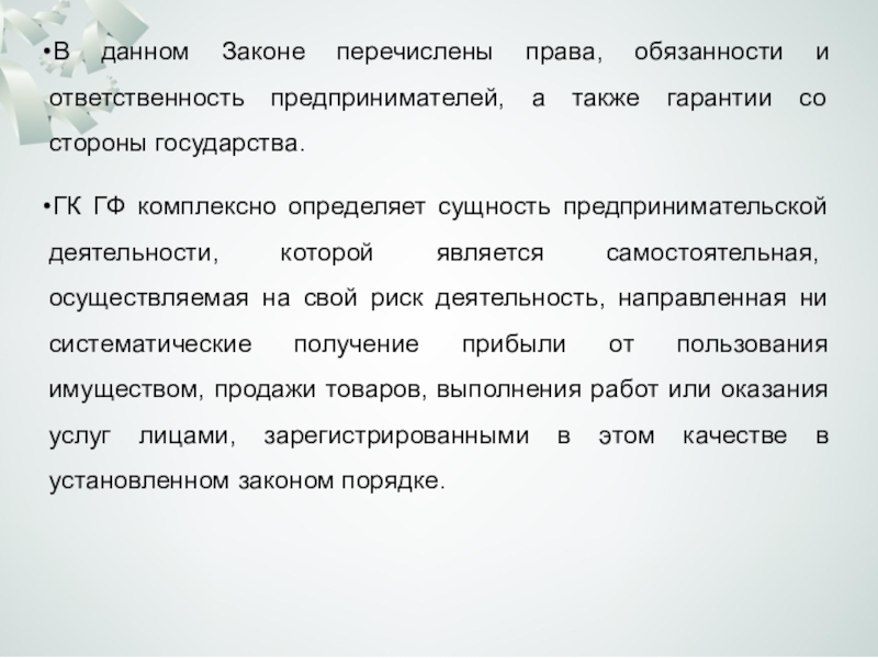 Слайд 12В данном Законе перечислены права, обязанности и ответственность предпринимателей, а также
