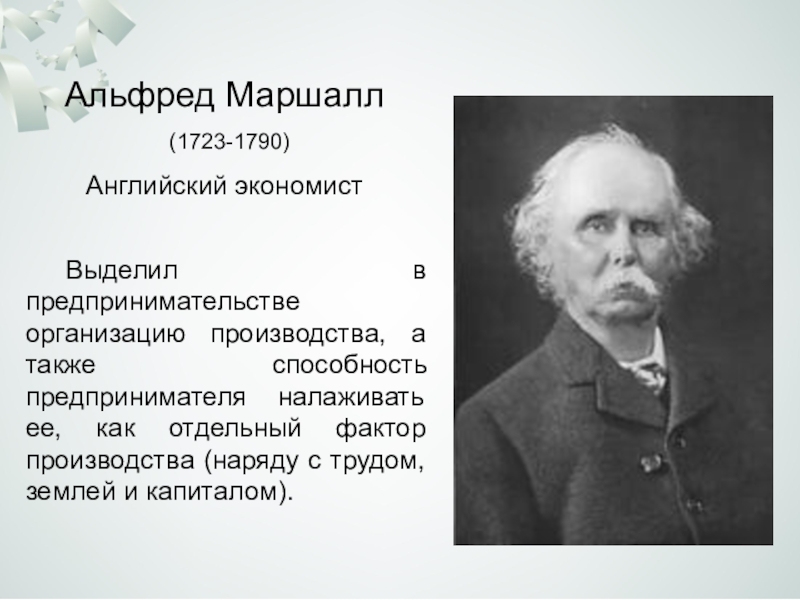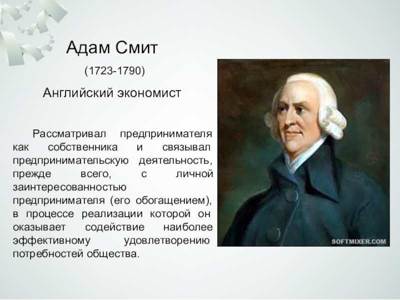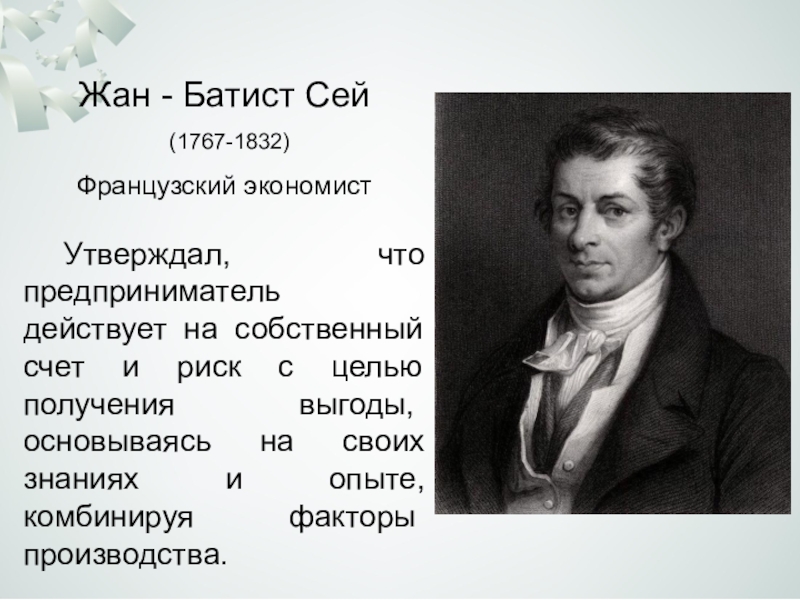 Рассматривал предпринимателя как собственника и связывал предпринимательскую деятельность, прежде всего,