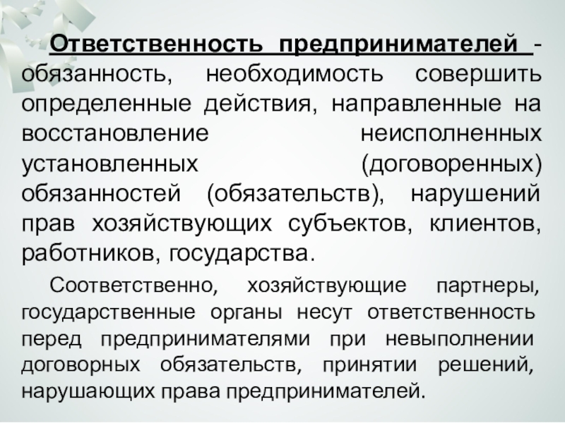 Слайд 44 Ответственность предпринимателей -обязанность, необходимость совершить определенные действия, направленные на восстановление неисполненных