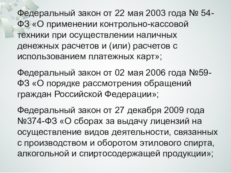 Слайд 30Федеральный закон от 22 мая 2003 года № 54-ФЗ «О применении