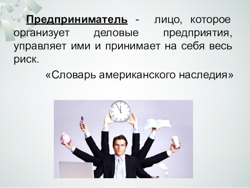 Слайд 10 Предприниматель - лицо, которое организует деловые предприятия, управляет ими и принимает