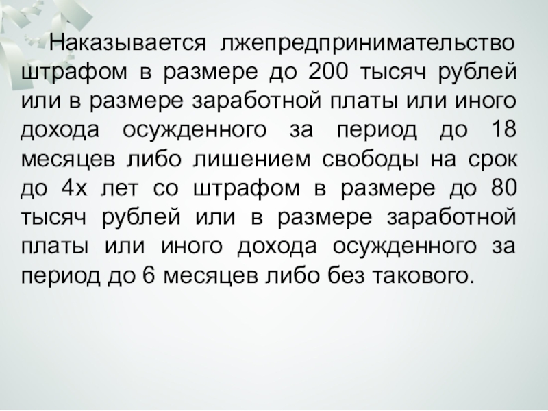 Слайд 57 Наказывается лжепредпринимательство штрафом в размере до 200 тысяч рублей или в