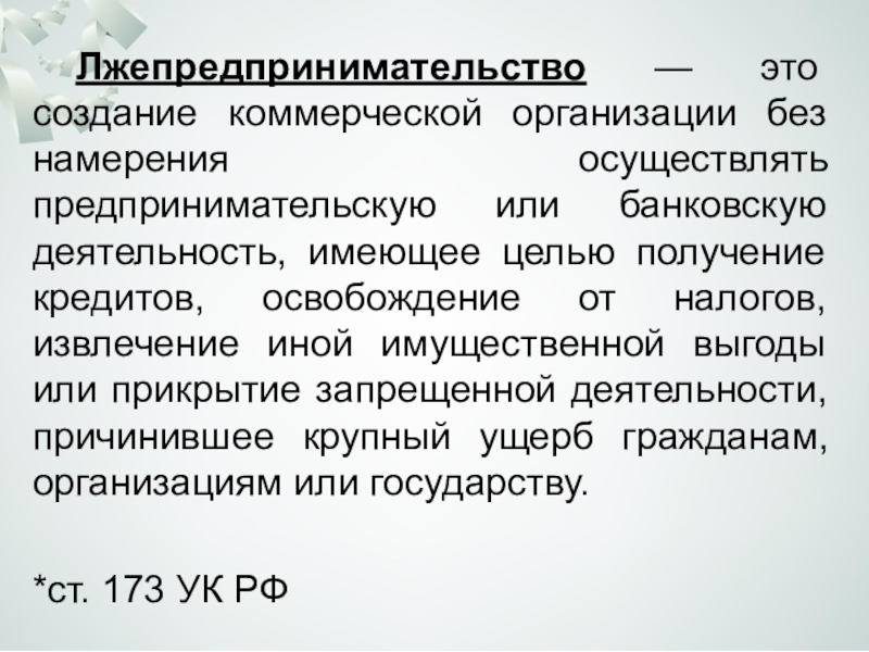 Слайд 56 Лжепредпринимательство — это создание коммерческой организации без намерения осуществлять предпринимательскую или
