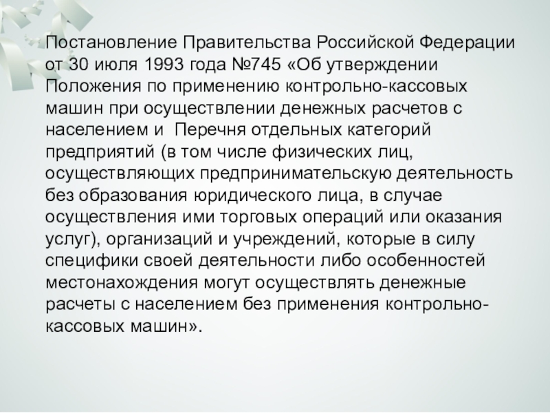 Слайд 33Постановление Правительства Российской Федерации от 30 июля 1993 года №745 «Об