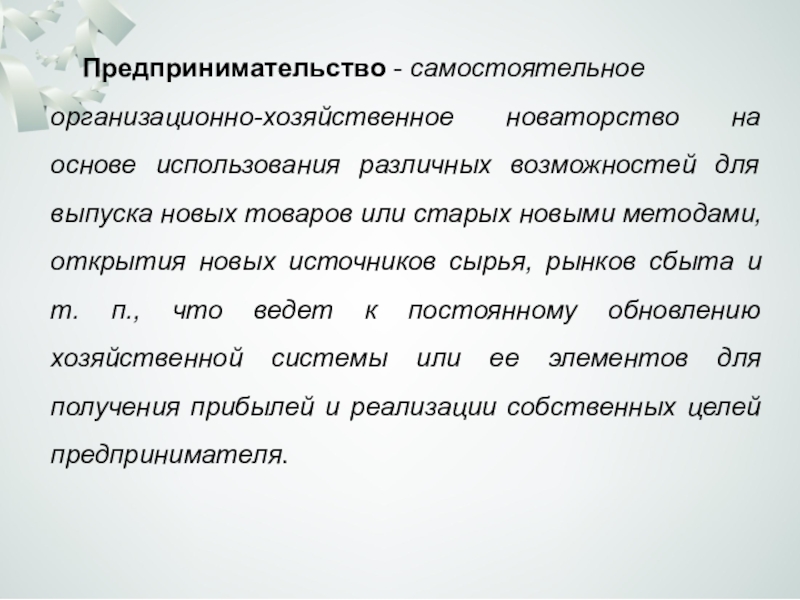 товаров или старых новыми методами, открытия новых источников сырья, рынков сбыта и т. п., что ведет к постоянному обновлению хозяйственной системы или ее элементов для получения прибылей и реализации собственных целей предпринимателя.