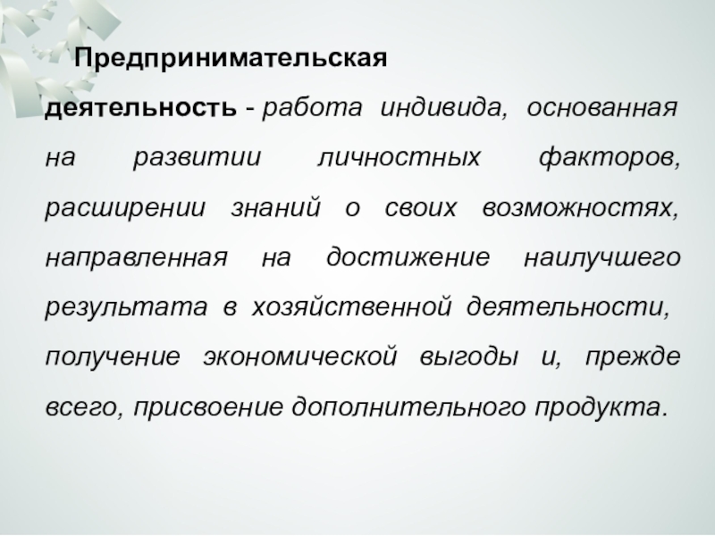 Слайд 19 Предпринимательская деятельность - работа индивида, основанная на развитии личностных факторов, расширении знаний о